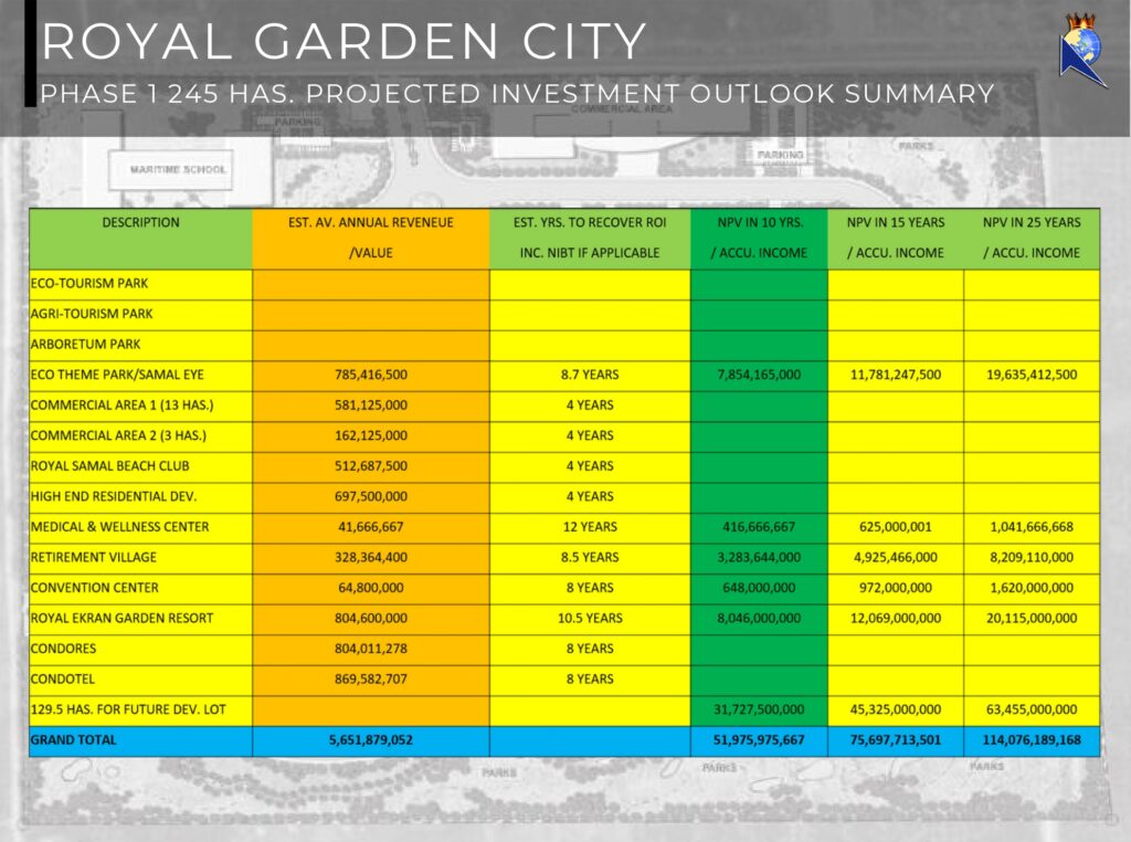 The two revenue sources from real estate and agriculture provide stability and significant development potential. The project’s distinct location and high expected profits make it an appealing investment prospect.